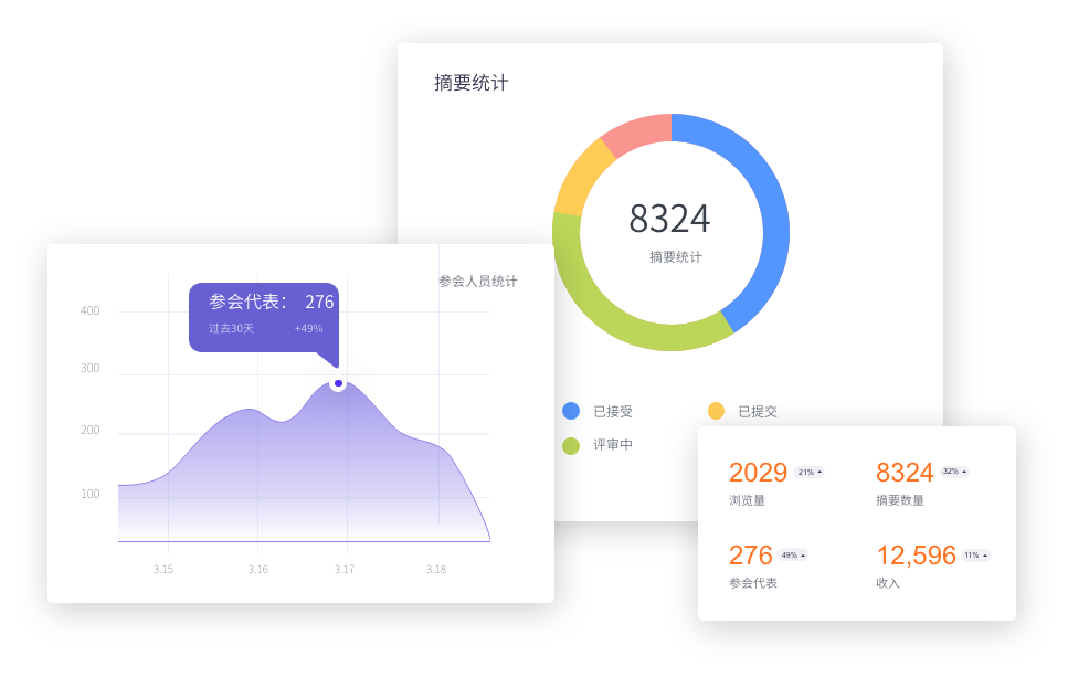 百格学术会议系统提供细致全面的会议数据统计,并以图表的方式直观展现,让会议组织者真正做到心中有数。